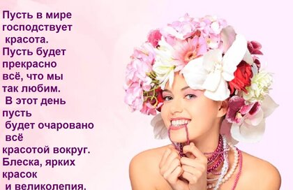 Открытки к международному дню красоты. Открытки с международным днем красоты. Международный день красоты отмечается каждый год 9 сентября. В этот день обычно проводятся конкурсы красоты, а так же конкурсы мастерства среди тех кто ее создает - парикмахеры, стилисты, визажисты, косметологи. Красота завораживает, восхищает и поднимает настроение и тонус. Достоевский в романе Идиот писал, что красота спасет мир, но там он писал о красоте души и красоте духовной. Если же говорить о красоте женской, но она скорее ведет к войне и раздорам среди мужчин желающих ей обладать и завистниц мечтающих ее испортить. Женская красота очень опасна и коварна, она сгубила не одну жизнь, а иногда даже была причиной войн (вспомните фильм Троя). Но одновременно с тем красота толкает на подвиги, на самосовршенствование мужчины во имя дамы его сердца. Обязательно поздравьте своих возлюбленных, подруг, да и просто знакомых с этим замечательным праздником.