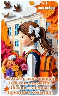 Открытки с первым сентября, открытки на 1 сентября, открытки с днем знаний. 1 сентября - это праздничный день для всех школьников, студентов и их родителей. Поздравьте своих друзей и знакомых с этим замечательным праздником. А мы желаем вам помнить о самом важном: о мудрости в жизни. Пусть в жизни вас и ваших детей всегда будет место знанию, мудрости, которые помогают справляться с житейскими неурядицами.