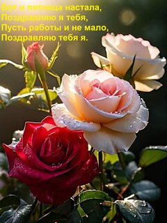 Открытки с наступающей и наступившей пятницей, поздравление с окончанием рабочей недели, пожелания удачной пятницы 13-го, и открытки с разнообразными фразами про пятницу. Все что связано с одним из самых любимых дней недели. Отправляйте своим друзьям поздравления с пятницей, радуйтесь, балдейте, расслабляйтесь и отрывайтесь. Ведь впереди выходные.
