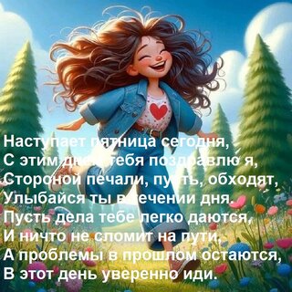 Открытки с наступающей и наступившей пятницей, поздравление с окончанием рабочей недели, пожелания удачной пятницы 13-го, и открытки с разнообразными фразами про пятницу. Все что связано с одним из самых любимых дней недели. Отправляйте своим друзьям поздравления с пятницей, радуйтесь, балдейте, расслабляйтесь и отрывайтесь. Ведь впереди выходные.