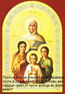 Открытки с днем Веры, Надежды, Любови и матери их Софьи. Вообще то это не праздник, а скорее памятная дата. Вера, Надежда и Любовь - это три маленькие девочки 12, 10 и 9 лет. Они верили в Христа, так же как и их мать София. Царствовавший в то время в Риме император Адриан пытался убедить семью отречься от веры - сначала уговорами, а потом пытками. Все его усилия оказались тщетными. Девочки умерли в муках, но не отреклись от Христа. Своим поступком они показали, что можно обладать великой силой духа даже при отсутствии большой физической силы. Вера, надежда и любовь - не только имена - это еще и названия трех главных христианских добродетелей, которые должны присутствовать в каждой счастливой семье. В современном мире молодые пары стараются сыграть в этот день свадьбу. А девочек родившихся в этот день называют Вера, Надежда или Любовь - считается, что они будут пользоваться особым покровительством святых.