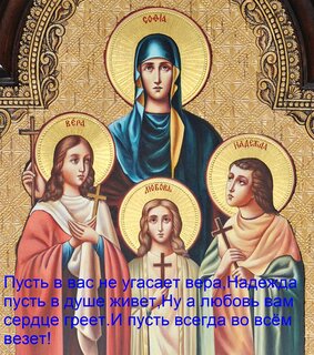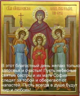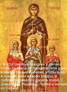 Открытки с днем Веры, Надежды, Любови и матери их Софьи. Вообще то это не праздник, а скорее памятная дата. Вера, Надежда и Любовь - это три маленькие девочки 12, 10 и 9 лет. Они верили в Христа, так же как и их мать София. Царствовавший в то время в Риме император Адриан пытался убедить семью отречься от веры - сначала уговорами, а потом пытками. Все его усилия оказались тщетными. Девочки умерли в муках, но не отреклись от Христа. Своим поступком они показали, что можно обладать великой силой духа даже при отсутствии большой физической силы. Вера, надежда и любовь - не только имена - это еще и названия трех главных христианских добродетелей, которые должны присутствовать в каждой счастливой семье. В современном мире молодые пары стараются сыграть в этот день свадьбу. А девочек родившихся в этот день называют Вера, Надежда или Любовь - считается, что они будут пользоваться особым покровительством святых.