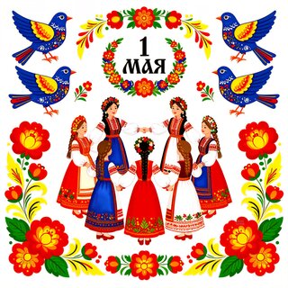 Иллюстрация в славянском народном стиле, посвященная празднику 1 Мая. В центре композиции группа девушек в традиционных национальных костюмах с вышивкой и венками на головах танцуют в хороводе. Изображение обрамлено пышным цветочным венком из красных и желтых цветов в технике росписи и украшено парой синих птиц с ярким оперением. В верхней части расположена надпись «1 МАЯ». Идеально подходит для оформления праздничных открыток, тематических материалов о славянской культуре, фольклоре и весенних праздниках.