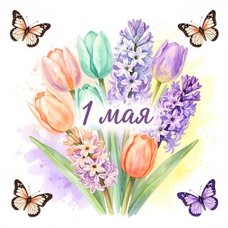 Красочная весенняя иллюстрация с букетом тюльпанов и гиацинтов в пастельных тонах: розовом, лавандовом, мятном и оранжевом. Композицию дополняют изящные бабочки и нежные акварельные разводы на светлом фоне. В центре расположена надпись «1 мая», что делает изображение идеальным для поздравительных открыток, оформления постов о Первомае, праздничных баннеров и весеннего декора. Высокое качество, нежный стиль и праздничная атмосфера.