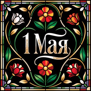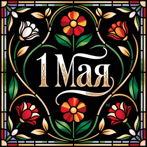 Иллюстрация в стиле витража, посвященная празднику 1 Мая. На черном фоне в золотой и зеленой рамке расположены декоративные красные и белые цветы с листьями. В центре композиции крупная белая надпись «1 Мая», выполненная изящным шрифтом с золотистыми элементами. Симметричный орнамент и яркие цвета создают праздничную атмосферу.