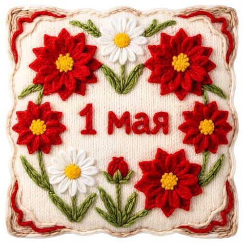 Декоративное текстильное панно ручной работы, посвященное празднику 1 Мая (Первомай). Уютная вышивка на светлом трикотажном фоне с яркими красными цветами и нежными белыми ромашками. Центральная надпись «1 мая» выполнена красными нитками. Композиция дополнена зелеными листьями и декоративной каймой по краям. Идеально подходит в качестве праздничного декора, сувенира или элемента оформления интерьера в стиле хендмейд.
