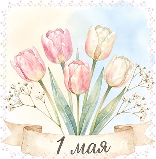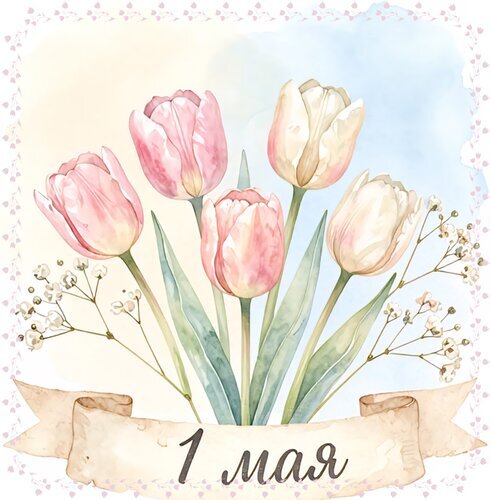 Красивая акварельная иллюстрация с букетом нежных тюльпанов розового и белого цвета на светлом пастельном фоне. Композиция дополнена мелкими полевыми цветами и декоративной лентой с надписью «1 мая», что делает изображение идеальным для поздравительных открыток, праздничного оформления весенних мероприятий и тематического дизайна к Первомаю. Стиль рисунка — мягкая акварель, создающая атмосферу свежести и весеннего цветения.