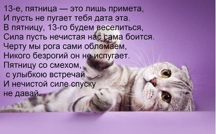 13-е, пятница — это лишь примета, и пусть не пугает тебя дата эта. В пятницу, 13-го будем веселиться, сила пусть нечистая нас сама боится. Черту мы рога сами обломаем, никого безрогий он не испугает. Пятницу со смехом, с улыбкою встречай и нечистой силе спуску не давай.