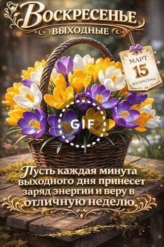 Анимированная открытка "15 марта Воскресенье. Выходные. Пусть каждая минута выходного дня принесет заряд энергии и веру в от"