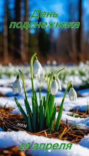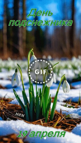 Красивое вертикальное изображение, посвященное Дню подснежника. На переднем плане крупным планом изображены нежные белые подснежники с зелеными стеблями, пробивающиеся сквозь остатки снега и сухую хвою на лесной подстилке. Фон представляет собой размытый весенний лес с высокими деревьями. На картинке нанесен текст на русском языке: сверху «День подснежника», внизу «19 апреля», а также небольшая надпись «маме». Изображение передает атмосферу пробуждения природы и ранней весны.