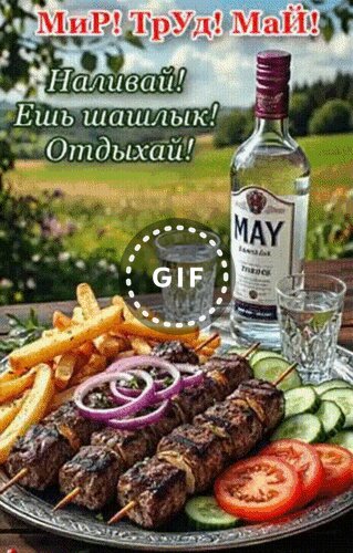 На картинке изображено аппетитное блюдо с шашлыком и картофелем фри, дополненное свежими овощами (помидорами и огурцами) и кольцами красного лука. Рядом стоит бутылка напитка с этикеткой «MAY». Сверху расположен яркий текст на русском языке: «МИР! ТРУД! МАЙ! Наливай! Ешь шашлык! Отдыхай!». Изображение передает атмосферу праздника, пикника на природе и отдыха на свежем воздухе в солнечный день.