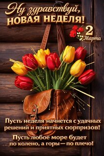 2 марта Ну, здравствуй, новая неделя! Пусть неделя начнется с удачных решений и приятных сюрпризов! Пусть любое море будет по колено, а горы - по плечо!