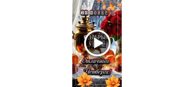 20 ноября С Добрым утром! Отличного четверга! Пусть новый день войдёт в ваш дом с миром и благословением! Хочу пожелать Вам счастья, удачи, здоровья и вдохновения! Пусть рядом будут забота и любовь близких,придовая силы и уверенность! Пусть хорошее настроение и божья благодать сопровождают весь день!