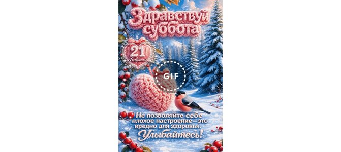 Анимированная открытка "21 февраля Здравствуй, суббота. Не позволяйте себе плохое настроение - это вредно для здоровья. Улыб"