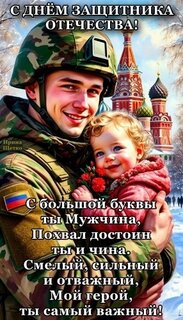 С днем защитника Отечества! С большой буквы ты Мужчина, похвал достоин ты и чина. Смелый, сильный и отважный, мой герой, ты самый важный!