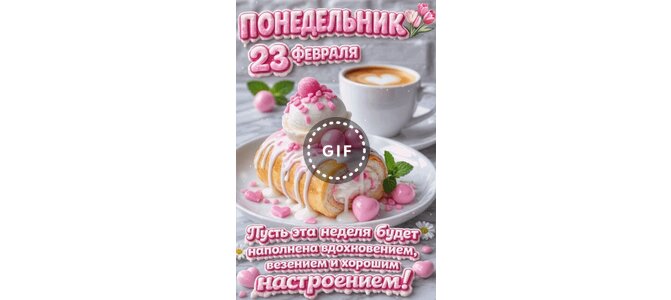 Анимированная открытка "23 февраля Понедельник Пусть эта неделя будетнаполнена вдохновением, везением и хорошим настроением!"