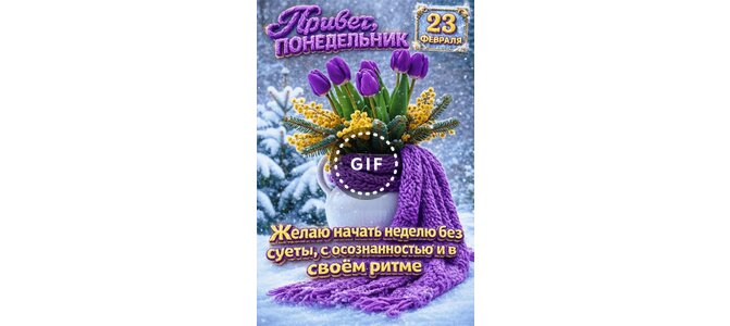 Анимированная открытка "23 февраля Привет, понедельник. Желаю начать неделю без суеты, с осознанностью и в своём ритме"