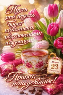 Анимированная открытка "23 марта Привет, Понедельник! Пусть эта неделя будет наполнена вдохновением и везением!"