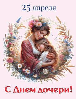 Красивая поздравительная открытка ко дню дочери, отмечаемому 25 апреля. На нежном фоне изображена любящая мать, нежно обнимающая свою маленькую дочь. Девушка украшена цветочным венком, а вся композиция обрамлена пышным венком из полевых цветов и колосьев. Иллюстрация выполнена в мягких, пастельных тонах, создавая атмосферу тепла, нежности и материнской любви. Идеально подходит для отправки в мессенджерах и социальных сетях как милое поздравление для мам и дочерей.