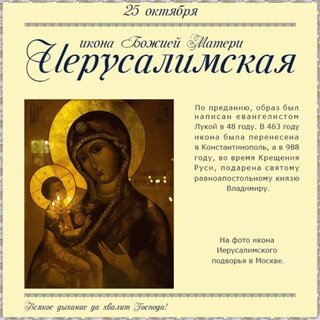25 октября Икона Божией Матери Иерусалимская. По преданию, образ был написан евангелистом Лукой в 48 году. В 463 году икона была перенесена в Константинополь, а в 988 году, во время Крещения Руси, подарена святому равноапостольному князю Владимиру.
