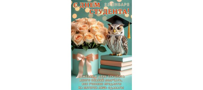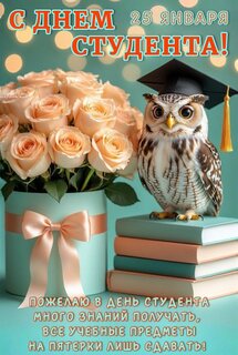 Открытка "25 ЯНВАРЯ. С ДНЕМ СТУДЕНТА! ПОЖЕЛАЮ В ДЕНЬ СТУДЕНТА МНОГО ЗНАНИЙ ПОЛУЧАТЬ, ВСЕ УЧЕБНЫЕ ПРЕДМЕТЫ НА П"