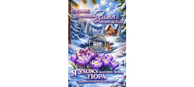 Анимированная открытка "28 февраля До свидания, Зима, скучать не буду. Я ухожу, промолвила Зима, - Пора. - Весна сказала ей"