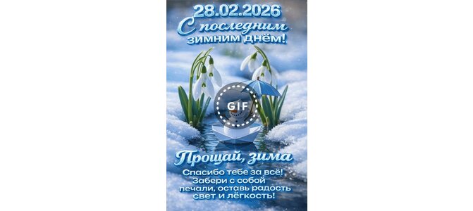 Открытка "28.02.2026 С последним зимним днём! Прощай, зима. Спасибо тебе за всё! Забери с собой печали, оставь"