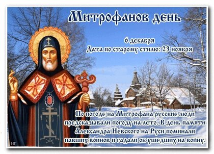 Митрофанов день. б декабря. Дата по старому стилю: 23 ноября. По погоде на Митрофана русские люди предсказывали погоду на дето. В день памяти Александра Невского на Руси поминали павших воинов и гадали об ушедших на войну.