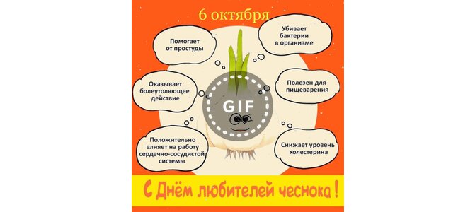 6 октября С днём любителей чеснока! Помогает от простуды. Убивает бактерии в организме. Полезен для пищеварения. Снижает уровень холестерина. Положительно влияет на работу сердечно-сосудистой системы. Оказывает болеутоляющее действие.