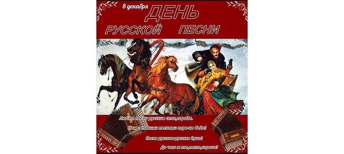 8 декабря день русской песни. Любят песни русские русские села, города. Нам с такими песнями горе-не беда! Песня русская-русская душа! До чего ж ты, песня, хороша!
