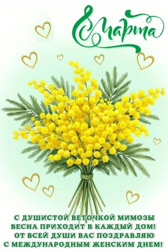 Открытка "8 МАРТА. С ДУШИСТОЙ ВЕТОЧКОЙ МИМОЗЫ ВЕСНА ПРИХОДИТ В КАЖДЫЙ ДОМ! ОТ ВСЕЙ ДУШИ ВАС ПОЗДРАВЛЯЮ С МЕЖДУ"
