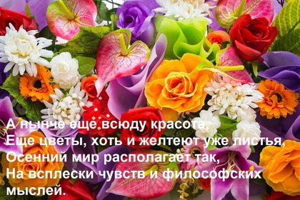 Открытка "А нынче еще всюду красота, Еще цветы, хоть и желтеют уже листья, Осенний мир располагает так, На всп"