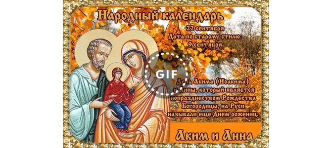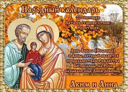 Народный календарь. 22 сентября. Дата по старому стилю: 9 сентября. День Акима (Иоакима) и Анны, который является попразднеством Рождества Богородицы, на Руси называли еще днем рожениц. Аким и Анна.