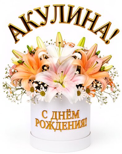 Красивый и роскошный подарочный букет из свежих лилий в белой круглой шляпной коробке. Композиция включает в себя нежные белоснежные и персиковые лилии, дополненные мелкими белыми цветами гипсофилы. На коробке золотистыми буквами нанесена праздничная надпись «С ДНЁМ РОЖДЕНИЯ!», а сверху расположен декоративный топпер с именем «АКУЛИНА!». Идеальный вариант для оригинального и элегантного подарка на день рождения женщине, маме или подруге. Стилизованный цветочный подарок в коробке подчеркивает торжественность момента.