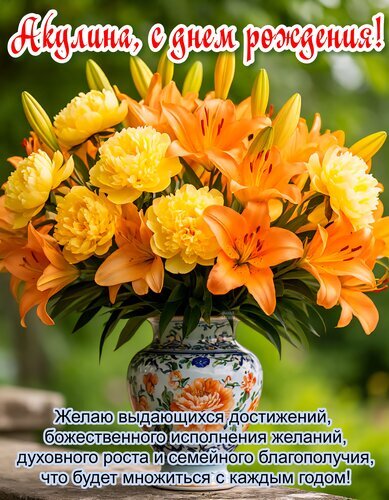 Красивая поздравительная открытка с пышным букетом ярко-оранжевых лилий и желтых пионов в декоративной вазе. На изображении размещен праздничный текст на русском языке: «Акулина, с днем рождения!» и пожелание выдающихся достижений, исполнения желаний, духовного роста и семейного благополучия. Идеальное изображение для отправки именного поздравления с днем рождения женщине по имени Акулина.