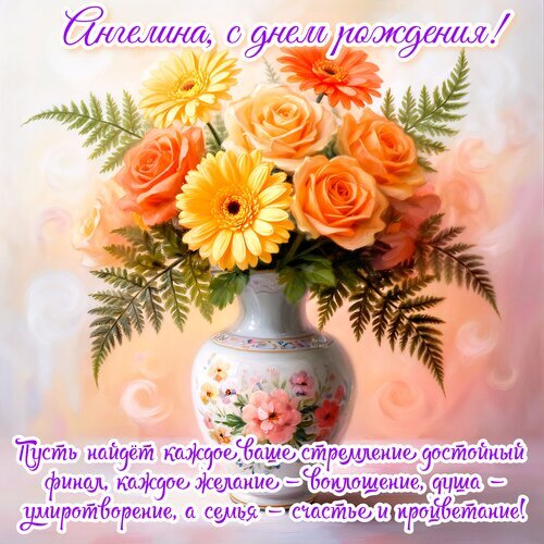 Красивая праздничная открытка к дню рождения с пышным букетом ярких оранжевых и желтых роз и гербер в декоративной вазе. На изображении расположена поздравительная надпись на русском языке: «Ангелина, с днем рождения!» и трогательное пожелание про стремления, желания, душевное умиротворение и семейное счастье. Иллюстрация выполнена в теплых, нежных тонах с мягким освещением, идеально подходит для отправки в мессенджерах или социальных сетях для поздравления девушки или женщины по имени Ангелина.