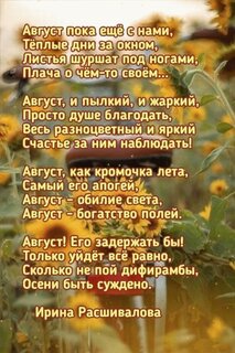 Август пока ещё с нами, Тёплые дни за окном, Листья шуршат под ногами, Плача о чём-то своём… Август, и пылкий, и жаркий, Просто душе благодать, Весь разноцветный и яркий Счастье за ним наблюдать! Август, как кромочка лета, Самый его апогей, Август – обилие света, Август - богатство полей. Август! Его задержать бы! Только уйдёт всё равно, Сколько не пой дифирамбы, Осени быть суждено. Ирина Расшивалова