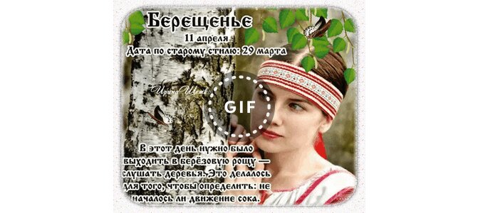 Берещенье 11 апреля. Дата по старому стилю:29 марта. В этот день нужно было выходить в березовую рощу - слушать деревья. Это делалось для того, чтобы определить не началось ли движение сока.