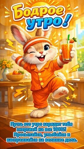 Яркая и позитивная иллюстрация с изображением милого мультяшного зайчика, который празднует бодрое утро. Зайчик одет в оранжевую пижаму с повязкой на голове, он весело танцует и держит в лапке стакан свежего апельсинового сока. На картинке присутствуют элементы солнечного света, молнии, символизирующие энергию, и вдохновляющая надпись на русском языке: "Пусть это утро зарядит тебя энергией на все 100%! Просыпайся, улыбайся и настраивайся на великие дела". Идеально подходит для пожеланий доброго утра, мотивационных постов и создания позитивного настроения.