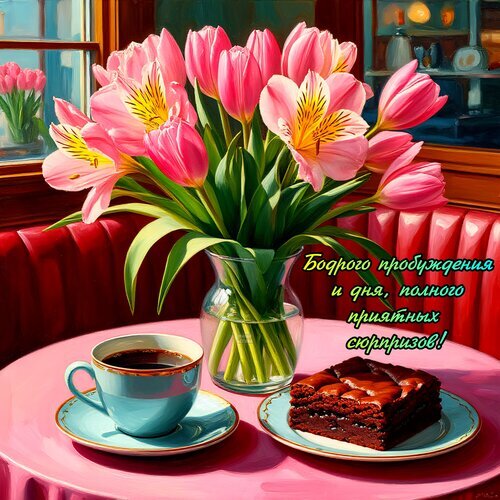 Красивая и уютная иллюстрация, изображающая букет нежно-розовых тюльпанов в стеклянной вазе, стоящий на розовом столе рядом с чашкой горячего кофе и аппетитным шоколадным брауни. Композиция наполнена солнечным светом и создает атмосферу бодрого и приятного утра. Идеально подходит для поздравительных открыток, пожеланий доброго утра и создания настроения уюта.