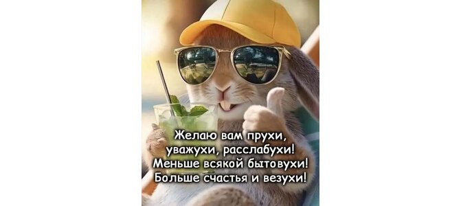 Желаю вам прухи, уважухи, расслабухи! Меньше всякой бытовухи! Больше счастья и везухи!