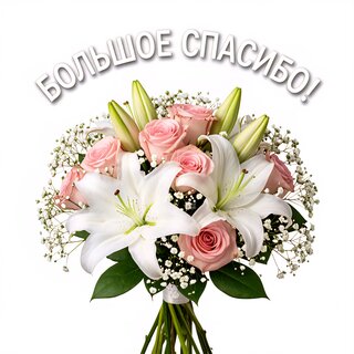 Красивый праздничный букет из нежных розовых роз и белоснежных лилий, дополненный воздушным гипсофилой. Композиция оформлена в классическом стиле и сопровождается надписью «БОЛЬШОЕ СПАСИБО!». Идеальное изображение для выражения благодарности, поздравительных открыток или использования в качестве поздравительной открытки в цифровом формате. Высокое качество, чистый белый фон, символизирует искренность, нежность и признательность.
