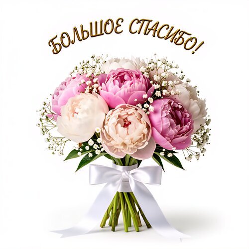 Красивый и нежный букет из пышных розовых и кремовых пионов, дополненный веточками гипсофилы. Букет перевязан элегантной белой атласной лентой и представлен на чистом белом фоне. Сверху расположена золотистая надпись на русском языке «БОЛЬШОЕ СПАСИБО!». Идеальное изображение для открытки, благодарственной записки или поздравительного сообщения в социальных сетях.