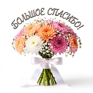 Красивый и пышный букет из разноцветных хризантем (розовых, оранжевых и белых), дополненный нежной гипсофилой. Букет перевязан элегантным белым атласным бантом. На изображении сверху расположена стильная надпись «БОЛЬШОЕ СПАСИБО!». Идеальное изображение для открытки, поздравительного сообщения или стоковой фотографии, чтобы выразить искреннюю благодарность.