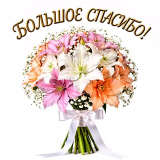 Красивый и пышный букет из нежных лилий розового, белого и персикового цветов, дополненный мелкими белыми цветами гипсофилы. Букет перевязан элегантной белой атласной лентой. На фоне расположена золотистая надпись «БОЛЬШОЕ СПАСИБО!», что делает изображение идеальным для поздравительной открытки, выражения благодарности, отправки в мессенджерах или использования в качестве поздравительного баннера. Высококачественное изображение на чистом белом фоне.