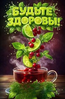 Аппетитное и вдохновляющее изображение, посвященное здоровому образу жизни и натуральным напиткам. На картинке запечатлен динамичный процесс: сочные ломтики лайма, спелые красные ягоды (клюква или брусника) и ароматные зеленые листья мяты эффектно падают в чашку с насыщенным травяным чаем. Сверху крупными зелеными объемными буквами на русском языке написано «БУДЬТЕ ЗДОРОВЫ!». Композиция дополнена летящими брызгами воды и легким паром, что создает ощущение свежести, бодрости и натуральности. Идеально подходит для контента о здоровом питании, детоксе, фитнесе и полезных рецептах.