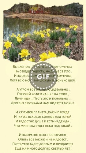 Бывает так. Проснёшься рано утром, На сердце радость, на душе светло. И за окошком небо с перламутром, Хотя всю ночь занудный дождик шёл. А утром всё так мило, идеально, Горячий кофе в чашке на столе, Яичница... Пусть это и банально И куст рябины видится в окне. И крутится планета, как и прежде, И так же всходит солнце над горой. И радостно душе, и есть надежда, Что мирным будет небо над тобой. И завтра это тоже повторится, Опять всё так же и не надоест. Пусть утро будет добрым и продлится Ещё на много долгих, светлых лет.