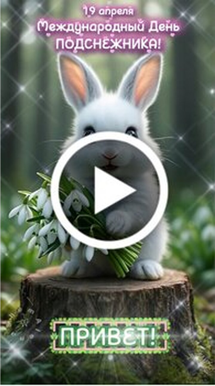Красивое поздравительное видео к Международному дню подснежника, который отмечается 19 апреля. В центре сюжета милый белый кролик, сидящий на лесном пне. Маленький зверек держит в лапках пышный букет нежных белых подснежников. Видео наполнено волшебной атмосферой благодаря мерцающим частицам света и мягкому лесному фону. Текстовые надписи приветствуют зрителя и дарят теплые пожелания, делая это видео идеальным способом поздравить близких с приходом весны и праздником первых цветов.