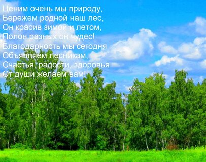 Теги:ценим очень мы природу, бережем родной наш лес, он красив зимой и летом, полон, разных, чудес, благодарность, сегодня, объявляем, лесникам, счастья, радости, здоровья от души желаем вам
