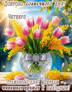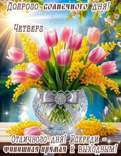 Теги:четверг, дни недели, цветы, мимоза, тюльпаны, река, добрый день, солнечного дня, финишная прямая-к выходным, красивая картинка